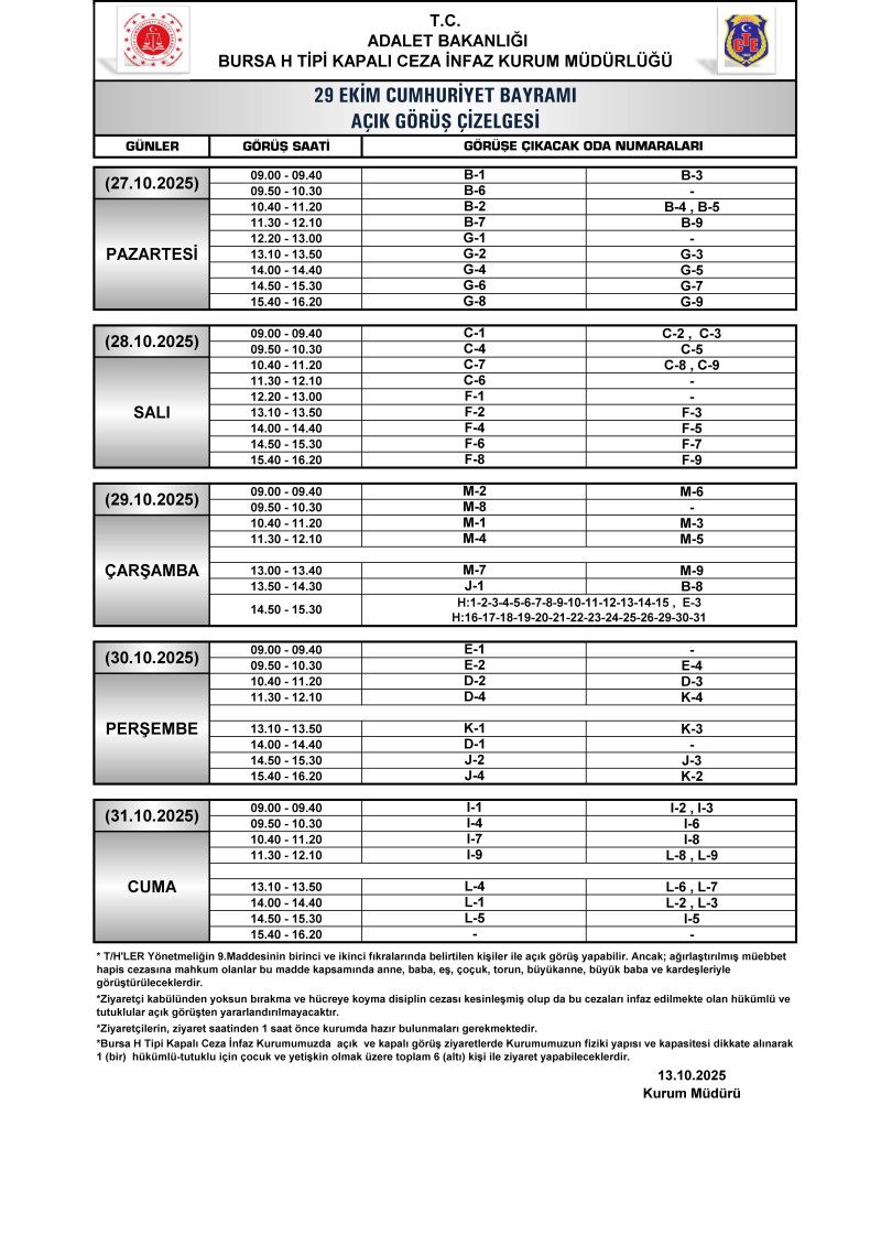 29 EKİM 2025 ZİYARET ÇİZELGESİ
